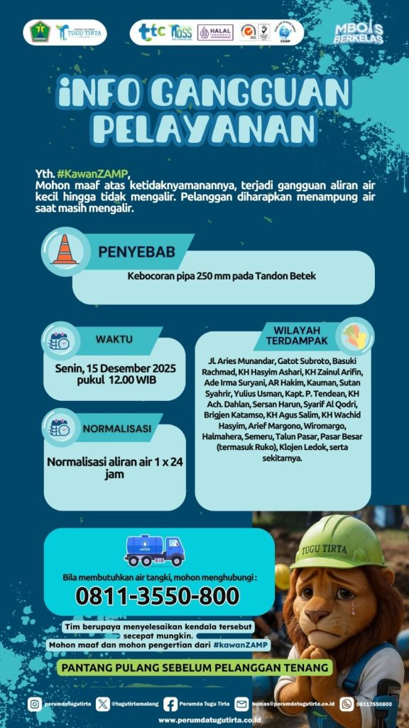 Ada 26 tempat terdampak atas perbaikan pipa pecah 20 mm tersebut, PDAM Kota Malang juga menyediakan layanan tangki air bersih dengan menghubungi 0811-3550-800, dimana layanan tangki air bersih tersebut gratis di berikan ke pelanggan sebagai bentuk layanan selama masih dalam perbaikan.