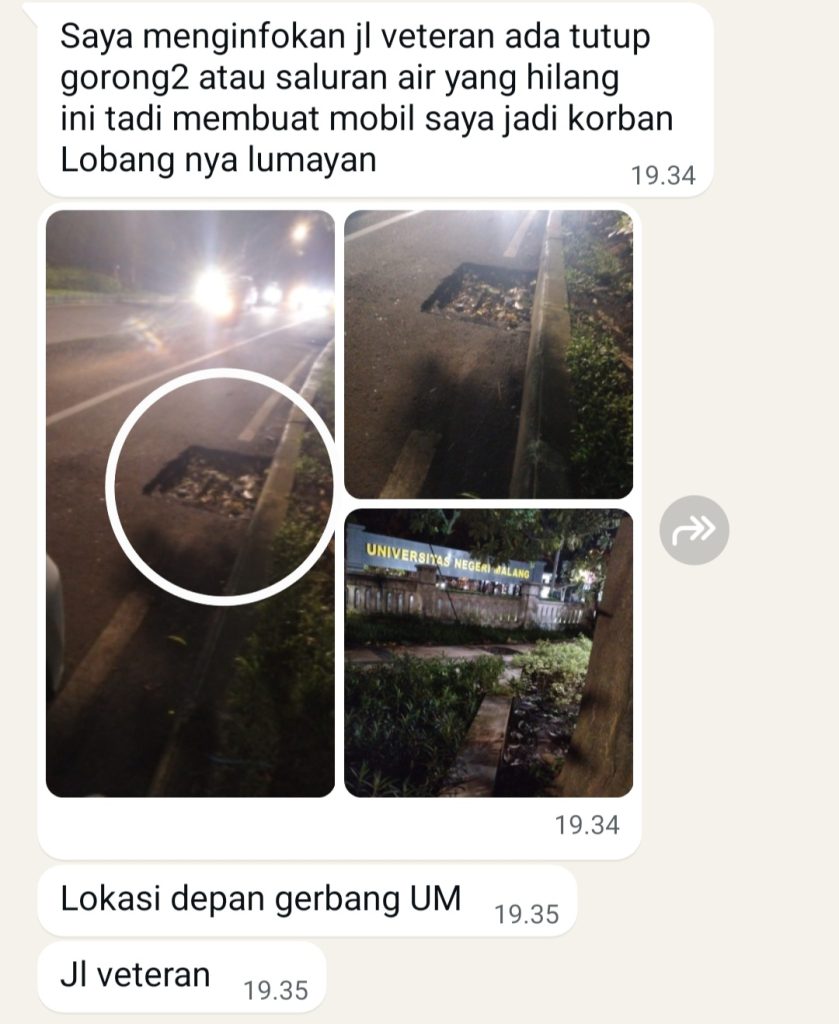 Korban jalan berlubang di Kota Malang, terus terjadi, kanal Pengaduan Publik Malang Raya mendapatkan pesan dari warga sukun (22/12/25), dimana yang bersangkutan menjadi korban jalan berlubang, mobilnya terperosok masuk kedalam lubang drainase yang tutupnya besinya hilang. ” Saya menginfokan jl veteran ada tutup gorong2 atau saluran air yang hilang ini tadi membuat mobil saya jadi […]